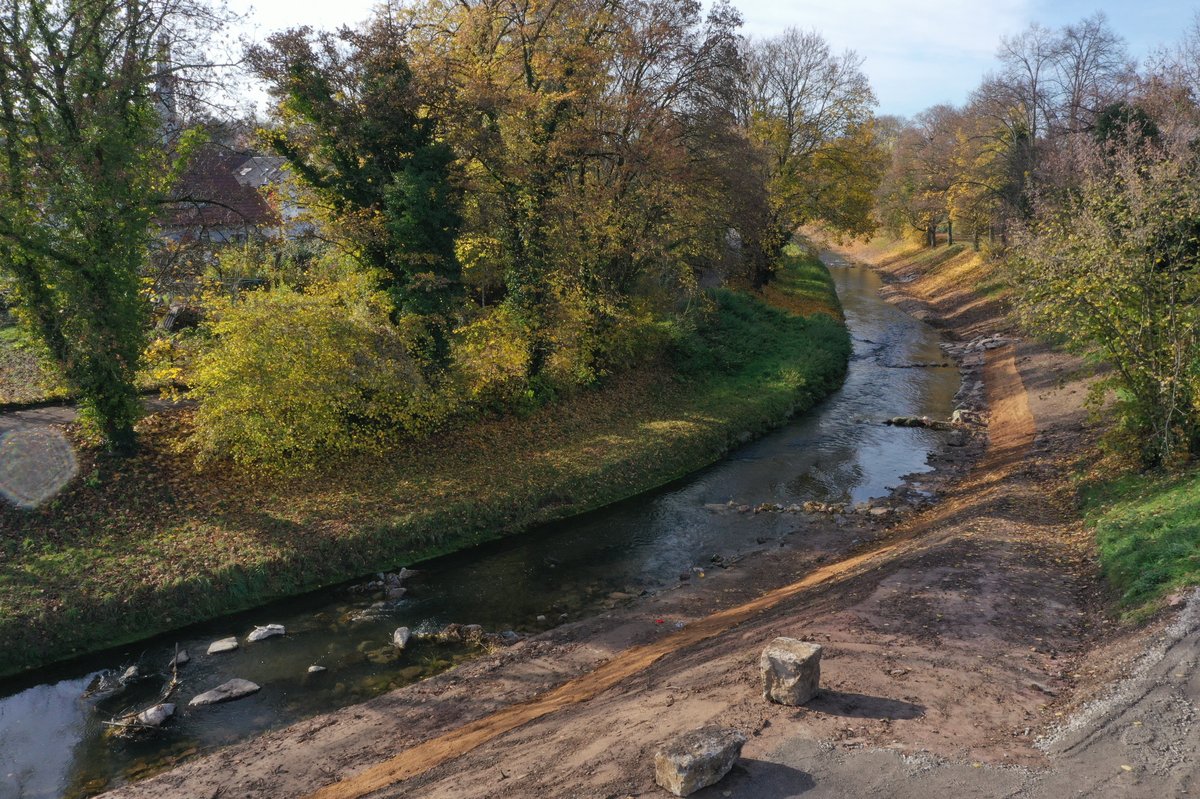 Die Pfinz fließt heute abwechslungsreicher, was gut an der Struktur der Wasseroberfläche zu erkennen ist.